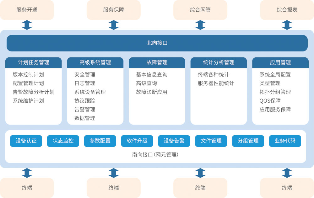 提供豐富的系統(tǒng)接口,支持北向與BOSS系統(tǒng)集成,南向與網關集成,為系統(tǒng)的運行和維護提供全面支持。