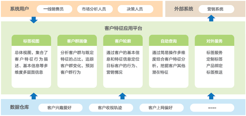 客戶(hù)全景洞察平臺(tái)基于不同角色的應(yīng)用目的,以技術(shù)驅(qū)動(dòng)和數(shù)據(jù)算法為核心,全方位洞察客戶(hù)需求,預(yù)測(cè)客戶(hù)群行為,洞悉市場(chǎng)發(fā)展,讓企業(yè)對(duì)市場(chǎng)有完整且真實(shí)的認(rèn)知。該平臺(tái)具有標(biāo)簽視圖、客戶(hù)群畫(huà)像、客戶(hù)輪廓、自助查詢(xún)和定制服務(wù)五大功能模塊,深度挖掘商機(jī),為企業(yè)決策層、業(yè)務(wù)人員、市場(chǎng)分析人員和一線營(yíng)銷(xiāo)人員提供基于運(yùn)營(yíng)商大數(shù)據(jù)的營(yíng)銷(xiāo)決策支持服務(wù)。