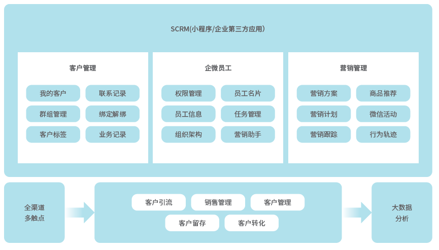 誠毅SCRM社交營銷管理系統(tǒng)幫助運(yùn)營商整合客戶資源數(shù)據(jù),形成客戶“觸達(dá)獲取—沉淀運(yùn)營—消費(fèi)轉(zhuǎn)化—留存復(fù)購”的正向閉環(huán),玩轉(zhuǎn)客戶私域流量池,建立一個(gè)更加智慧、高效的新型營銷關(guān)系。
