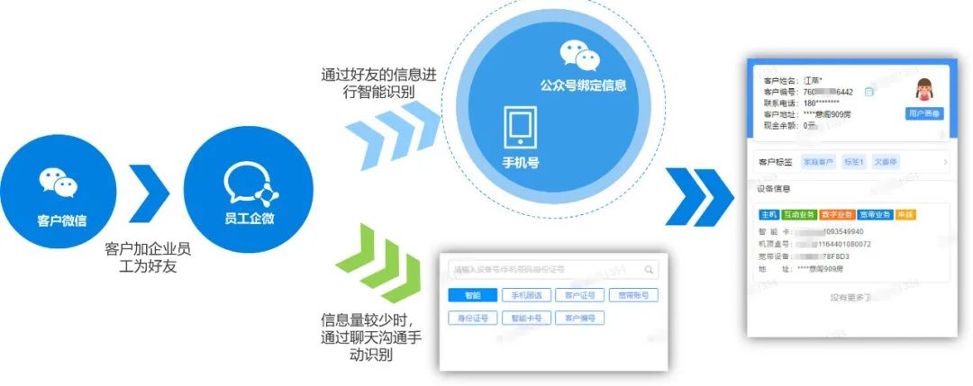 找到客戶資源,打造企微私域流量池:網(wǎng)格人員奮戰(zhàn)在第一線直接接觸客戶,近水樓臺(tái)先得月,利用裝維服等各種機(jī)會(huì),讓客戶添加企業(yè)微信。添加企業(yè)微信后,誠毅SCRM后臺(tái)自動(dòng)識(shí)別客戶并進(jìn)行BOSS賬戶綁定,如果無法自動(dòng)識(shí)別,可通過聊天溝通手動(dòng)識(shí)別,實(shí)現(xiàn)客戶信息獲取,將公域流量轉(zhuǎn)化為企業(yè)私域流量,后續(xù)裝維服務(wù)和業(yè)務(wù)繳費(fèi)訂購都可以通過企微在線辦理,客戶既不用再跑營業(yè)廳,網(wǎng)格人員也不用重復(fù)上門。