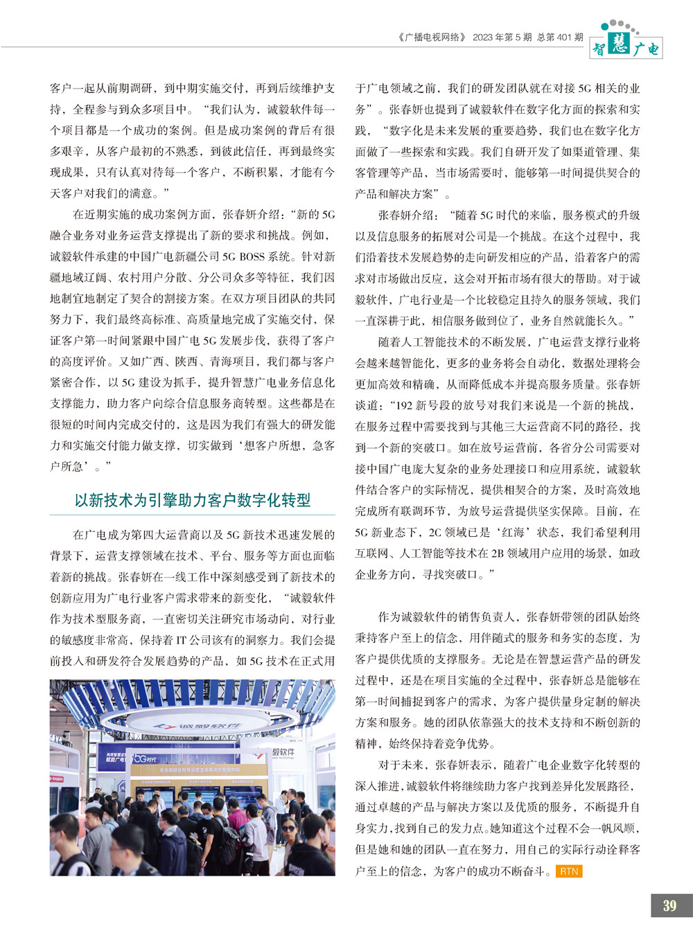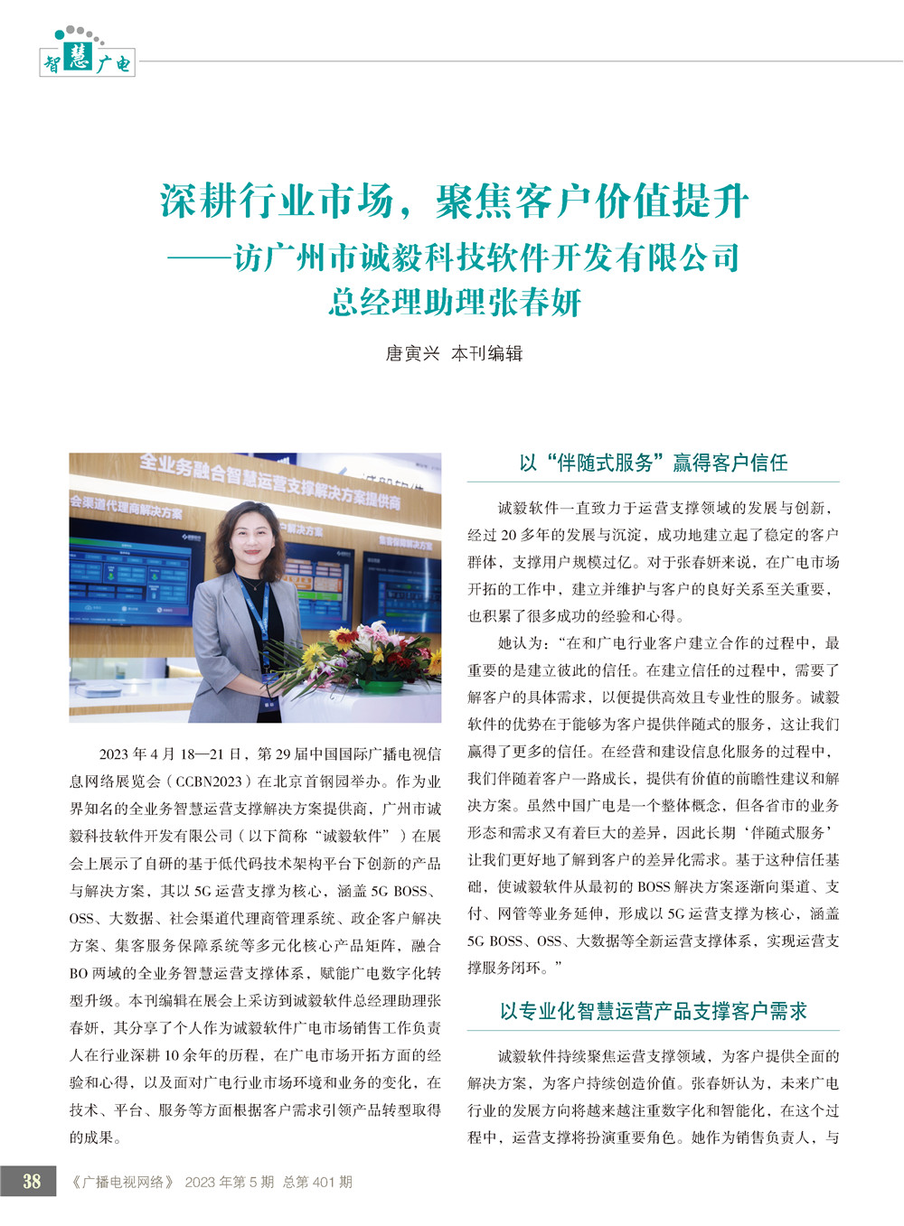 2023年4月20日,在第二十九屆中國(guó)國(guó)際廣播電視信息網(wǎng)絡(luò)展覽會(huì)(CCBN2023)上,誠(chéng)毅軟件總經(jīng)理助理張春妍女士接受了《廣播電視信息》雜志專訪,張春妍分享了個(gè)人作為誠(chéng)毅軟件廣電銷售工作負(fù)責(zé)人在行業(yè)深耕十余年的歷程,在廣電市場(chǎng)開拓方面的經(jīng)驗(yàn)和心得,以及面對(duì)廣電行業(yè)市場(chǎng)環(huán)境和業(yè)務(wù)的變化,在技術(shù)、平臺(tái)、服務(wù)等方面根據(jù)客戶需求引領(lǐng)產(chǎn)品轉(zhuǎn)型取得的成果。
