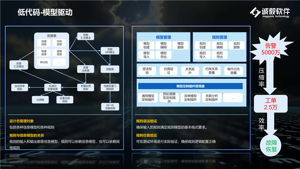 在演講中,張穎慧先生還介紹了業(yè)務(wù)運(yùn)維保障平臺(tái)應(yīng)用的兩個(gè)核心技術(shù):低代碼和AI技術(shù)在AI在運(yùn)維領(lǐng)域的應(yīng)用。低代碼的核心能力在于系統(tǒng)可配置性,使得故障管理具有高靈活的擴(kuò)展性,從容應(yīng)對(duì)各種場(chǎng)景。我們的低代碼平臺(tái)DOne已成功在多個(gè)廣電省級(jí)網(wǎng)絡(luò)中落地商用。