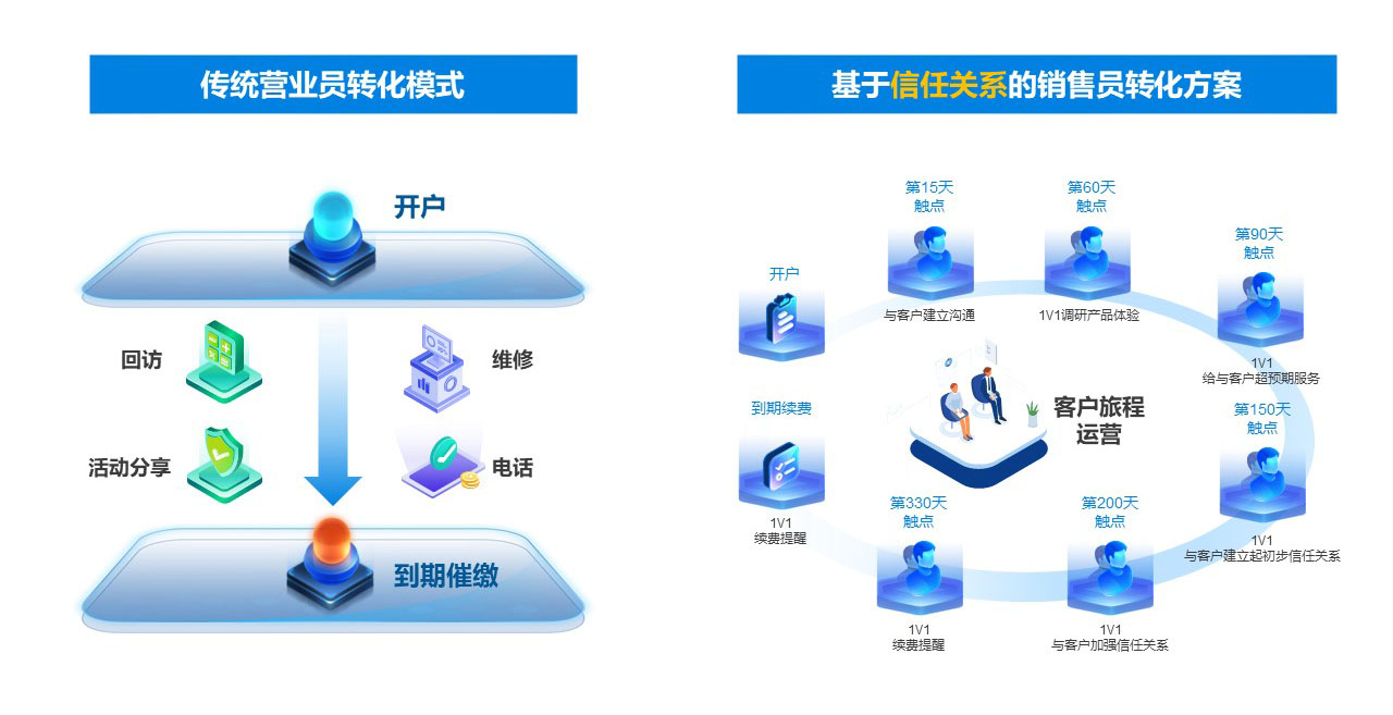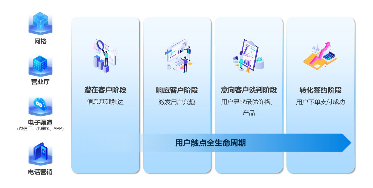 圍繞客戶需求,覆蓋從潛在客戶觸達(dá)、新客戶轉(zhuǎn)化、老客戶維護(hù)到流失客戶召回的全過程,實(shí)現(xiàn)個(gè)性化服務(wù),提升滿意度。