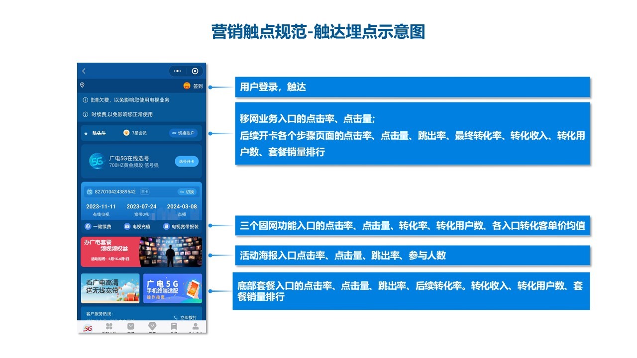 規(guī)范營銷觸點(diǎn),確保用戶在各個(gè)接觸點(diǎn)上獲得一致的體驗(yàn)。包括APP、網(wǎng)站、社交媒體、營業(yè)廳等。通過觸點(diǎn)規(guī)范化,提高用戶參與度和轉(zhuǎn)化率。