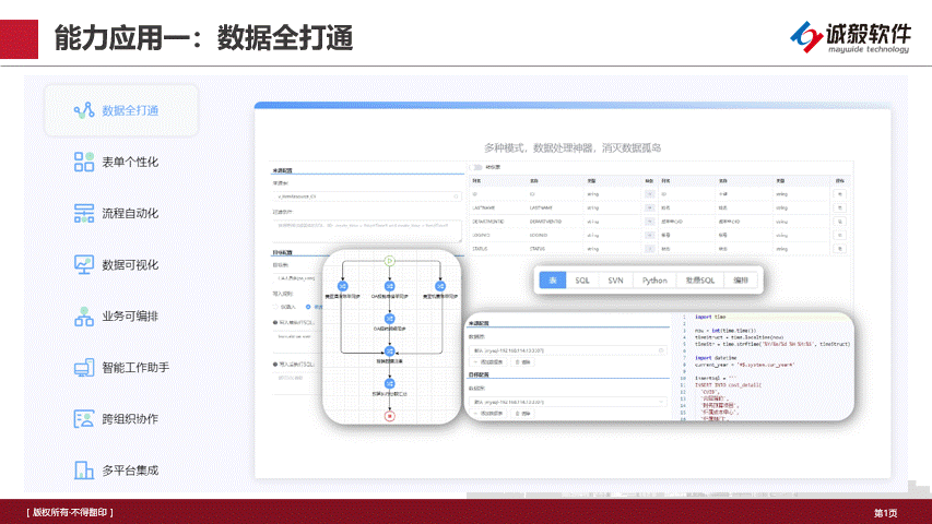 發(fā)布會(huì)上,唐昊先生詳細(xì)介紹了誠智云臺(tái)的八大核心能力。從實(shí)現(xiàn)數(shù)據(jù)無縫整合的全打通能力,到滿足個(gè)性化需求的表單功能;從提升效率的流程自動(dòng)化,到直觀展示數(shù)據(jù)的數(shù)據(jù)可視化;再到靈活應(yīng)對(duì)變化的業(yè)務(wù)可編排,以及簡化操作的智能工作助手,每一項(xiàng)功能都是助力企業(yè)數(shù)字化轉(zhuǎn)型的堅(jiān)實(shí)一步。