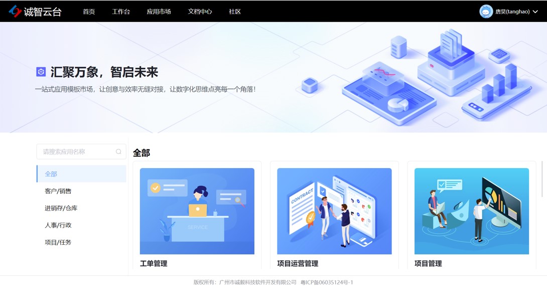 接著,唐昊先生重點(diǎn)介紹了誠智云臺(tái)的應(yīng)用市場和工作臺(tái)是兩個(gè)尤為值得關(guān)注的亮點(diǎn),它們?yōu)槠髽I(yè)提供了前所未有的便利性和靈活性。