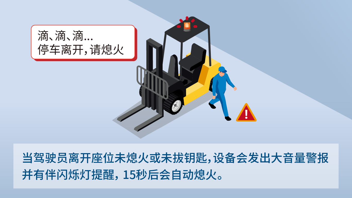 當(dāng)駕駛員離開座位未熄火或未拔鑰匙,設(shè)備會(huì)發(fā)出大音量警報(bào)并伴有閃爍燈提醒,15秒后叉車將會(huì)自動(dòng)熄火。