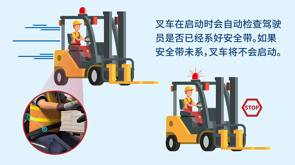 叉車在啟動(dòng)時(shí)會(huì)自動(dòng)檢查駕駛員是否已經(jīng)系好安全帶。如果安全帶未系,叉車將不會(huì)啟動(dòng)。