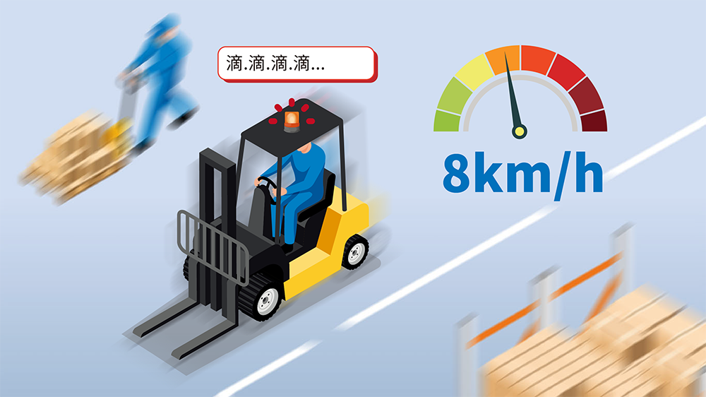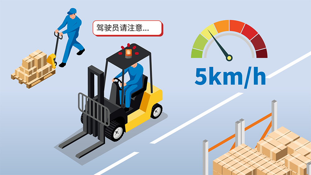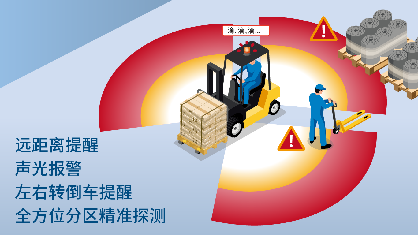 為叉車劃定作業(yè)區(qū),檢測(cè)車輛的左、右、后三路方向,當(dāng)有工作人員或貨物接觸到紅光,燈光快速閃爍,同時(shí)喇叭發(fā)出警報(bào),系統(tǒng)還會(huì)自動(dòng)進(jìn)行限速剎車,提醒工作人員遠(yuǎn)離危險(xiǎn)源。